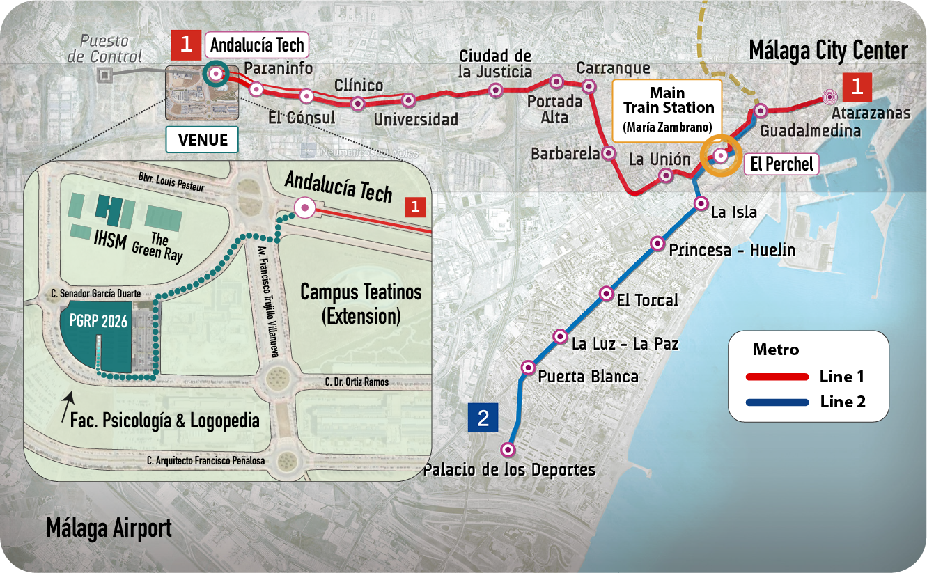 From the train station: take the metro line L1 at the metro station "El Perchel" direction Andalucía Tech, until the end of the line (Andalucía Tech)